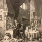 In a rustic workshop, a craftsman meticulously shoemakers by candlelight, surrounded by tools. A group of patrons sits at a table, engaged in conversation, adding to the vibrant scene.