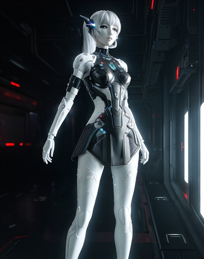 "((full body)), autonomous module Nymph, perfect body, standing with legs apart, parted legs, wearing short white deeply cut-out dress, natural looking face, serene smile parted lips", artificial intelligence, cyberpunk, cyberspace, digital age, 8k, acrylic painting by Akihiko Yoshida, intricate detailed, hyper-detailed, cinematic lighting, photorealistic, soft shadow, main colors Silver and Black, vector illustration, ultra HD, realistic with vivid colors, highly detailed, pen and ink technique, perfect composition, intricately detailed octane render, popular on ArtStation, 8k resolution, photorealistic concept art, soft natural light with volumetric cinematic effects