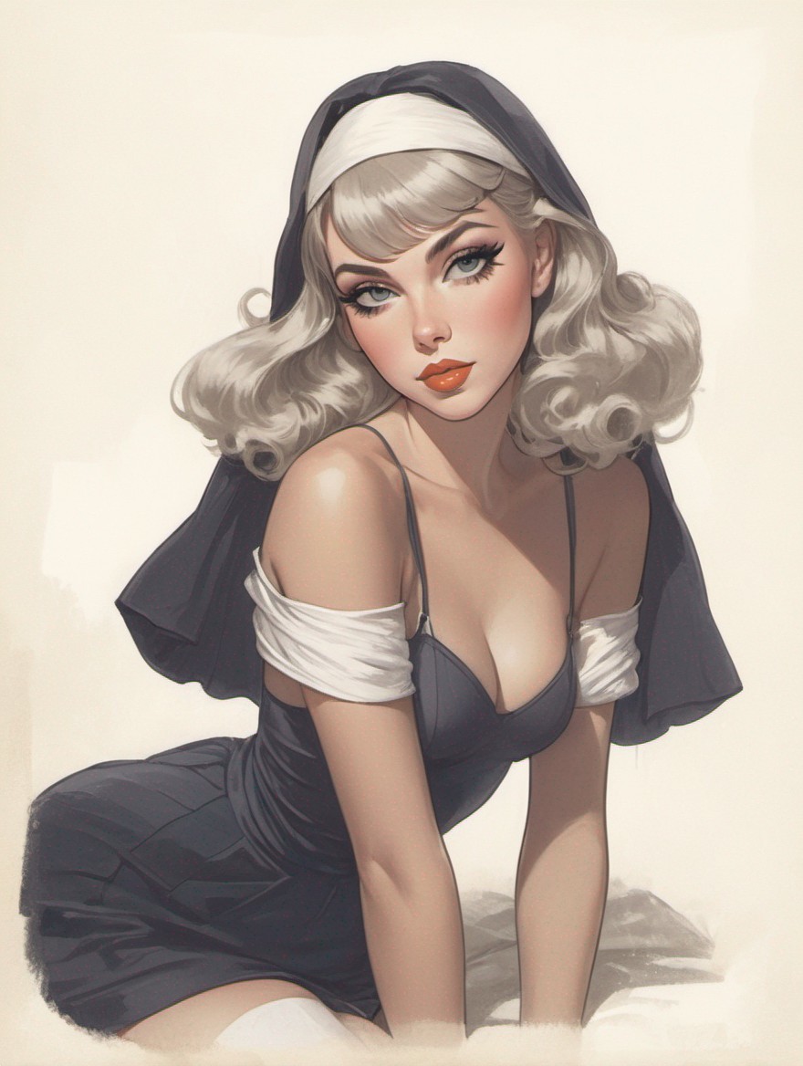 An illustrated woman with short blonde hair and pink sunglasses, wearing a blue outfit and white accessories, poses against a cream backdrop.
