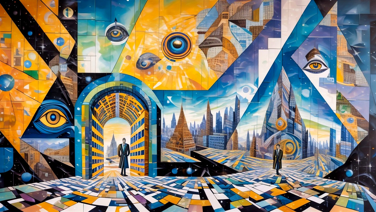 A vibrant mural features surreal geometric designs, towering structures, and abstract eyes. Figures stand in a striking tunnel, evoking a sense of curiosity and exploration in a dreamlike landscape.