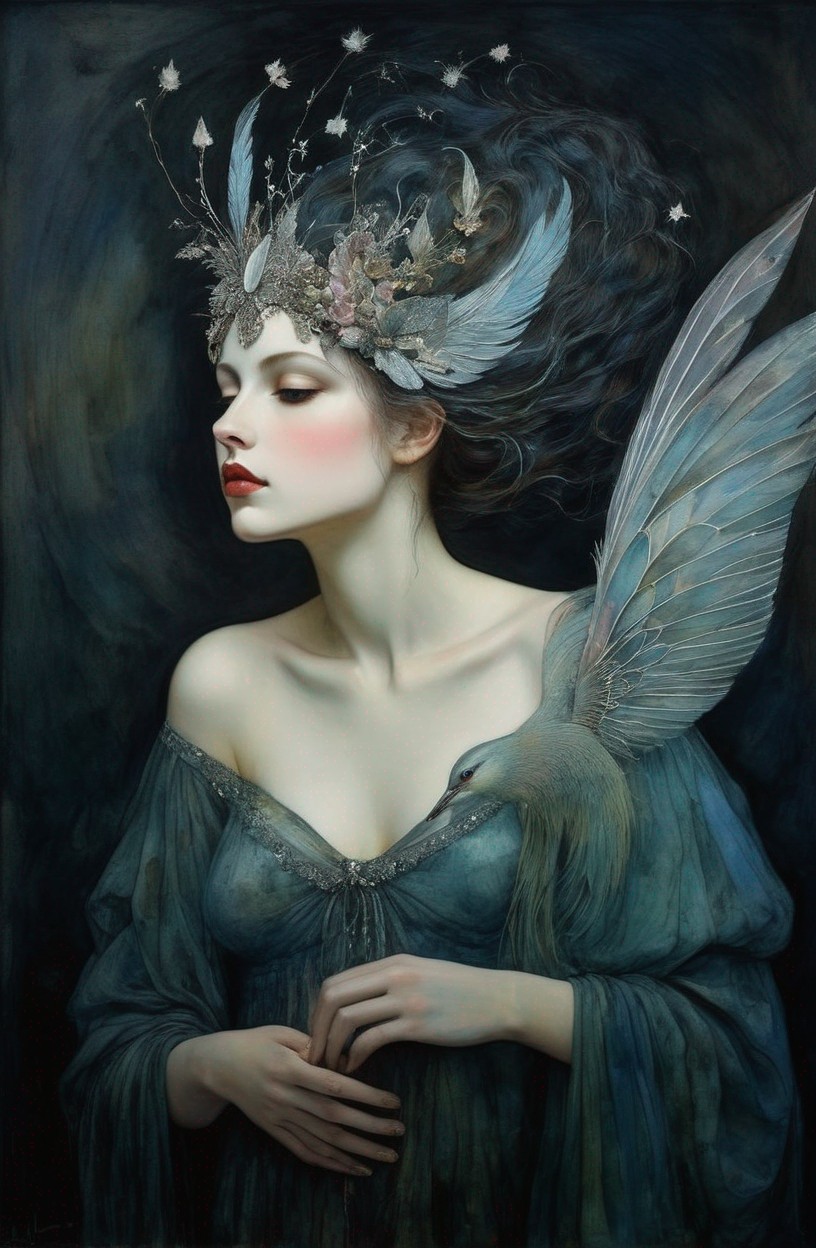 Prompt: Spirit nymph fantasy dark magic in the style of Sulamith Wulfing