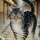 A majestic tabby cat strolls through a serene, traditional street lined with lanterns and wooden buildings, surrounded by mist and lush greenery, exuding confidence and charm.