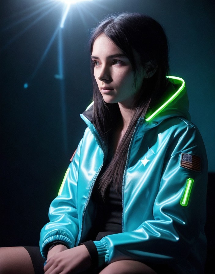 A painting of a young woman in a glowing teal jacket looking pensive against a dark, starry background.