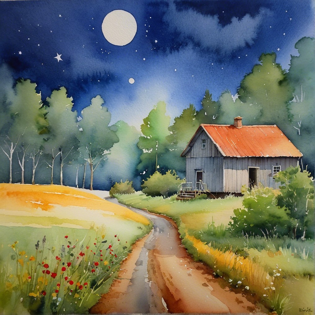 A vibrant landscape features two charming houses surrounded by lush greenery and colorful flowers. A winding path leads through the serene scene, illuminated by a bright moon and twinkling stars.