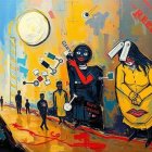 A vibrant, abstract painting featuring expressive figures, bold colors, and surreal elements. The scene depicts a blend of emotions, with contrasting characters and a dreamlike atmosphere.