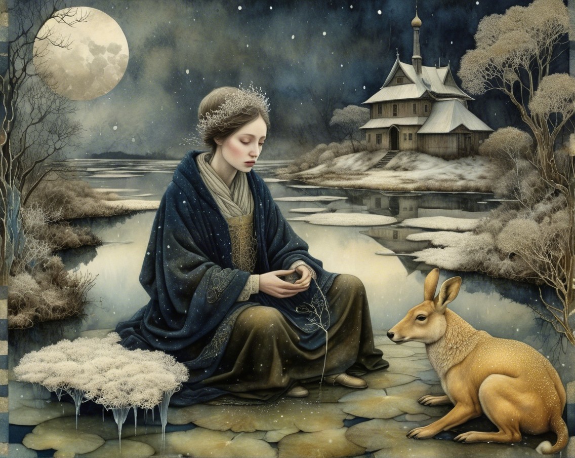A serene scene featuring a young woman in a blue robe sitting on a snowy bank, gazing at her hands, while a gentle deer approaches her. A full moon illuminates a distant, snow-covered house.
