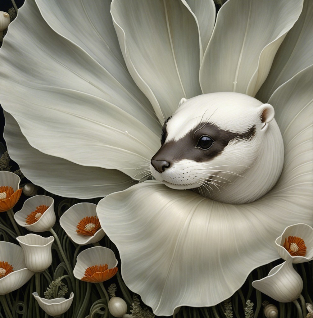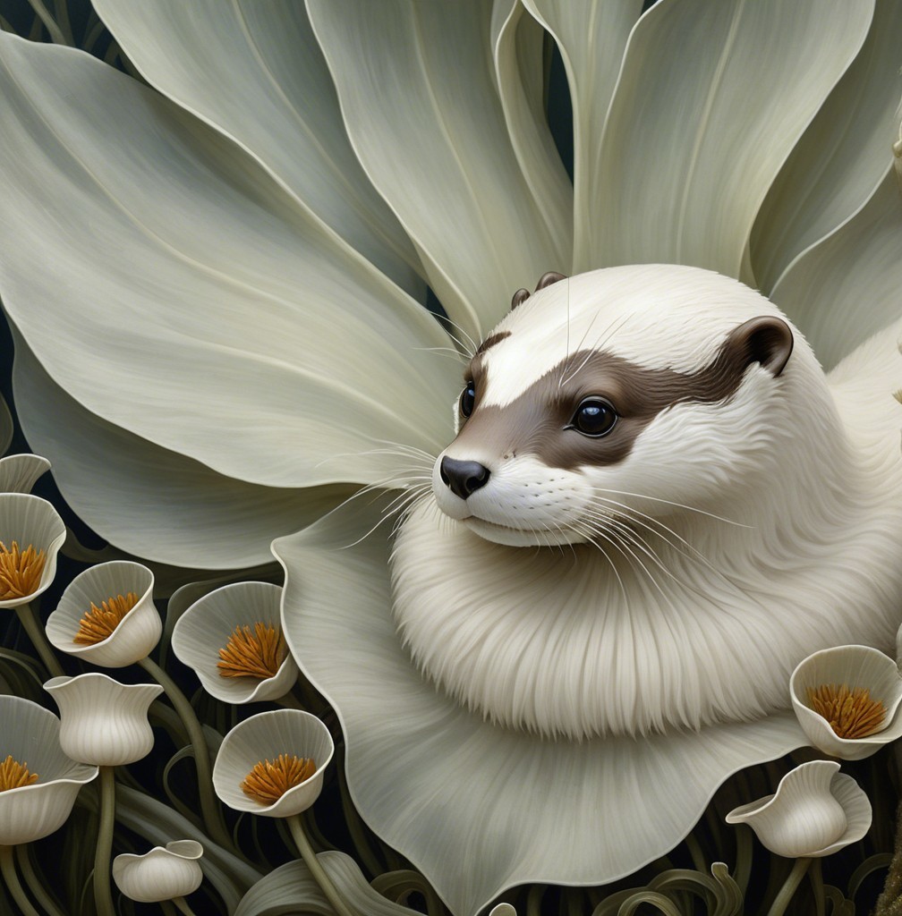 A playful otter nestled among large, flowing leaves and delicate flowers. Its fur glistens in a serene underwater setting, creating a harmonious blend of nature and tranquility.
