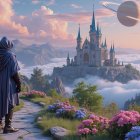 Hooded Figure on Stone Path Overlooking Fantasy Landscape