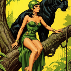 A woman in a green dress and helmet sits gracefully on a tree branch, poised next to a powerful black panther. The lush jungle backdrop is vibrant, with a bold yellow sky adding drama.