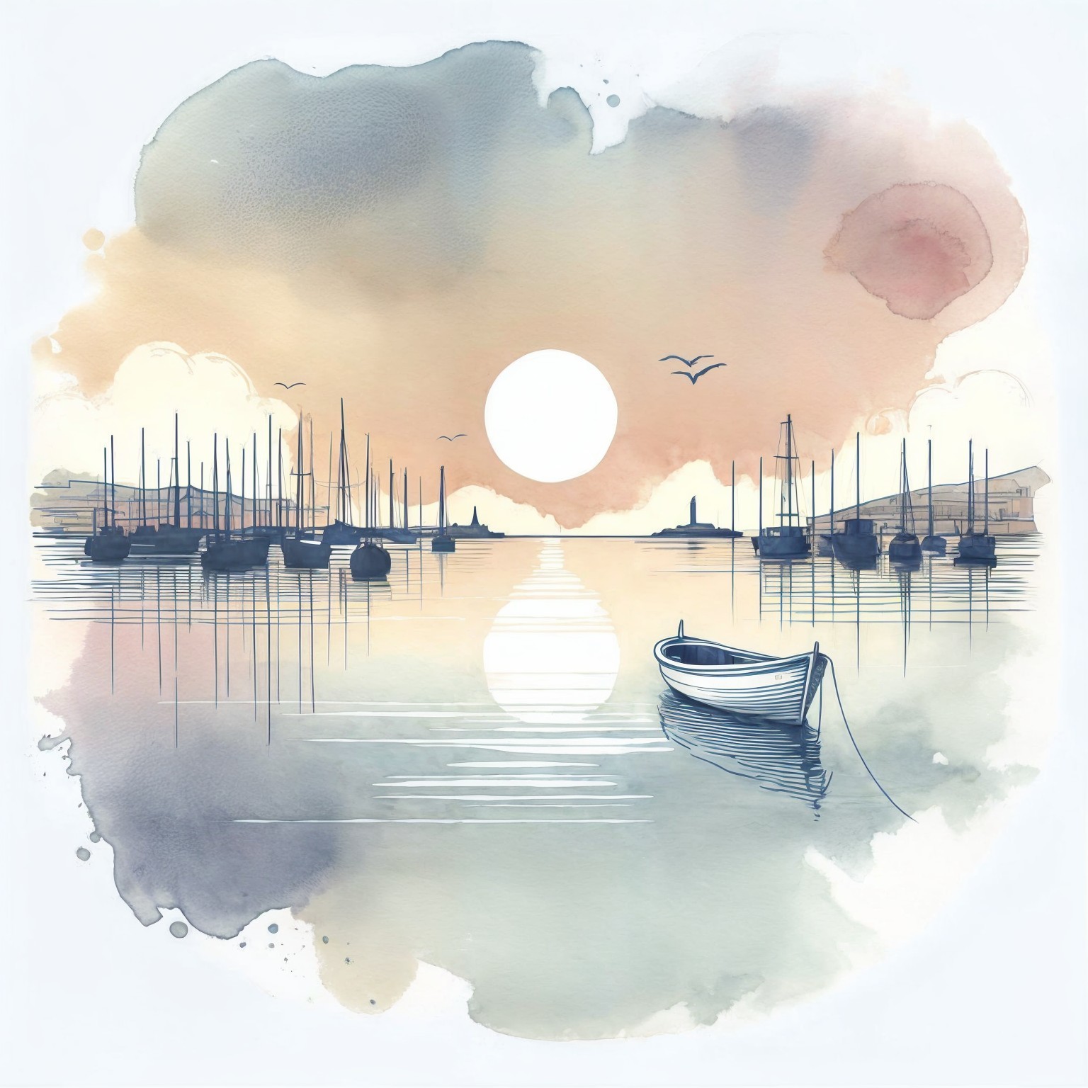 A serene watercolor scene depicts a calm harbor at sunrise, with a lone boat moored in the foreground and silhouettes of sailboats and a lighthouse in the distance, surrounded by soft pastel hues.