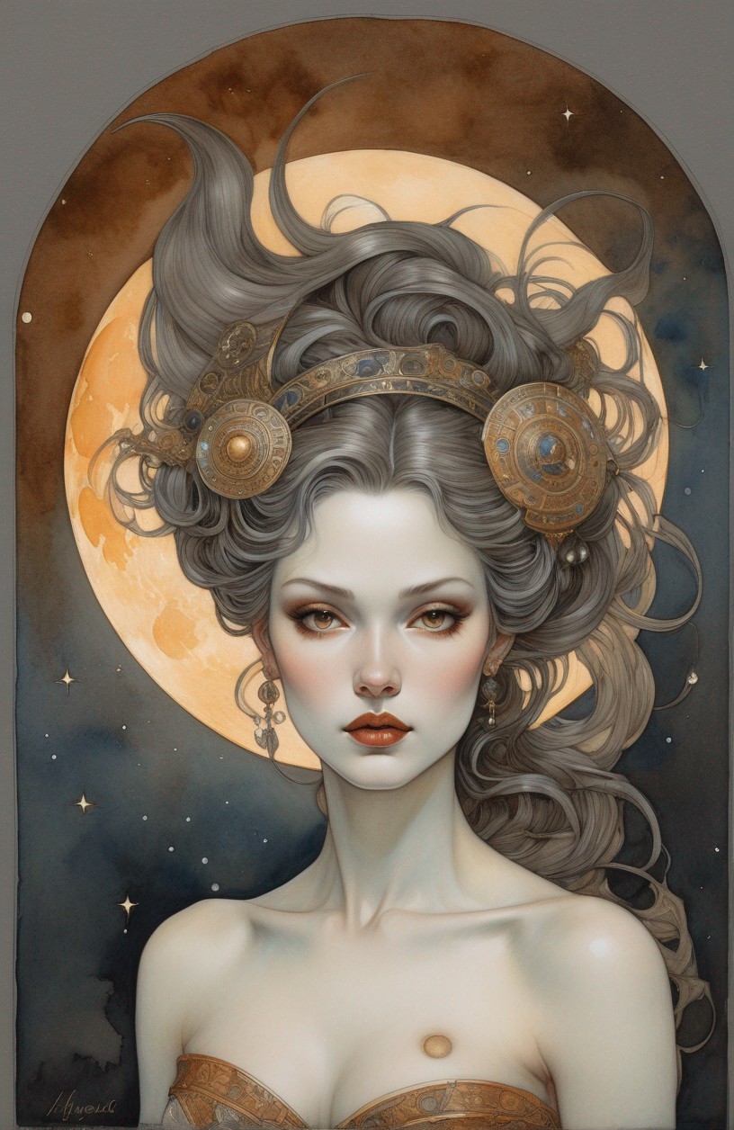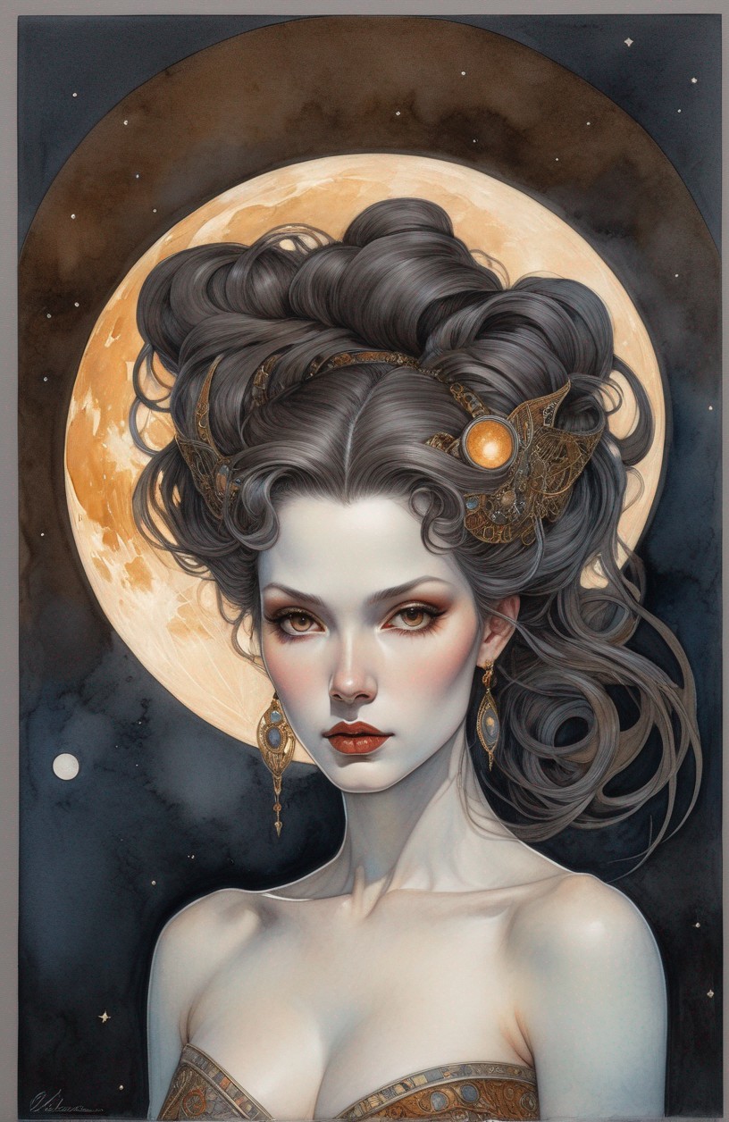 + Prompt:The malevolent sorceress is depicted with an awe-inspiring allure, illuminated by the moon's glow. The detailed pencil sketch showcases anatomical accuracy and muted tones, with contour lines accentuating her enchanting appearance, especially her captivating brown eyes. The artwork draws inspiration from masters like Egon Schiele, Alphonse Mucha, and Gustav Klimt. Watercolor techniques reminiscent of Pino Daeni and Josephine Wall enhance the witch's beauty. The subdued palette, wet on wet and splash effects evoke the styles of Steve Hanks, Vladimir Volegov, and Mark Spain. The moody ambiance is achieved through desaturated colors, as seen in the works of Saturnino Herran and Ella du Cane. Overall, the portrayal flawlessly captures the witch's facial features.