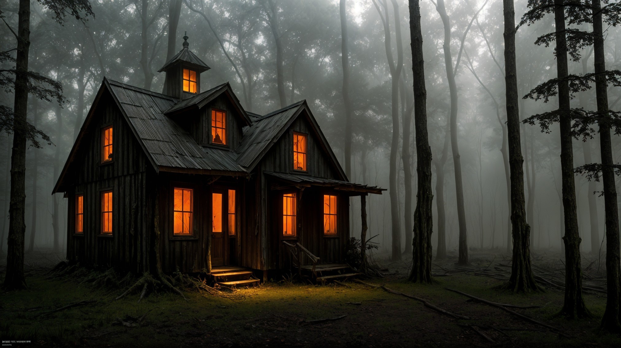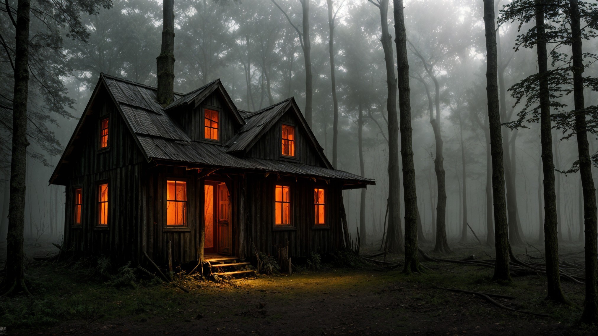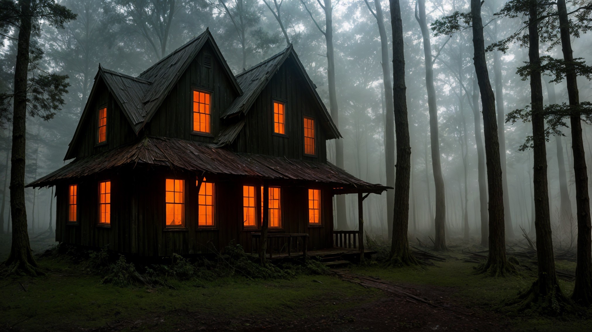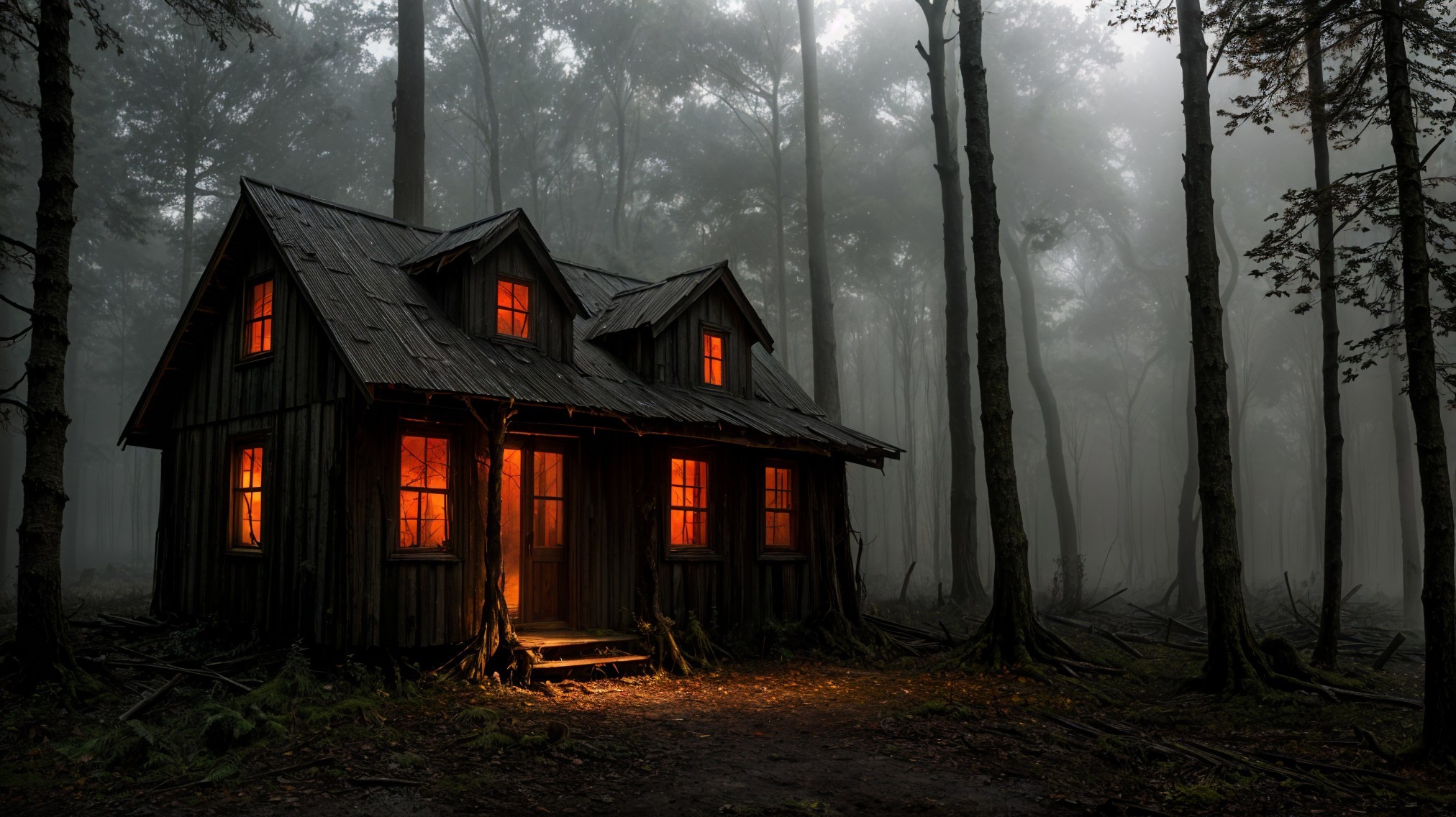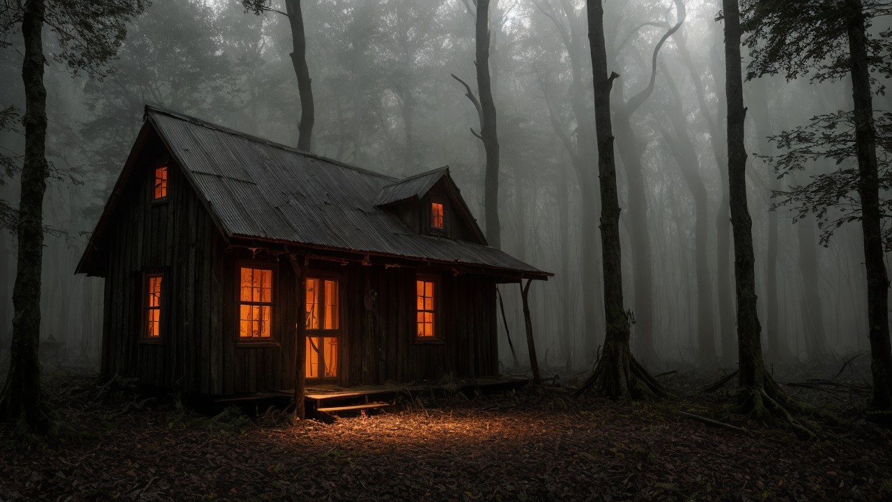Prompt: "Eerie abandoned shack, mystical dark forest, twisted gnarled trees, vibrant Autumn leaves, twilight setting, chilling atmosphere, isolated and desolate, haunting vibes, overgrown vegetation, mysterious shadows, eerie mist, creaking wooden planks, worn-out structure, magical ambiance, digital painting, detailed and atmospheric, dark color palette with pops of autumnal hues, dramatic lighting casting long shadows"