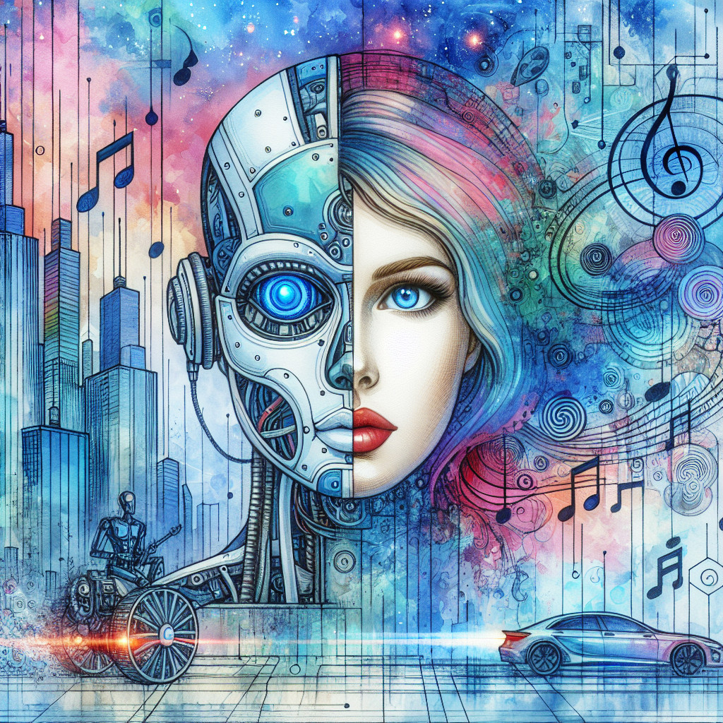 A vibrant, abstract illustration of a half-human, half-cybernetic face, adorned with gears and musical notes, symbolizing the fusion of technology and art, set against a colorful cosmic backdrop.