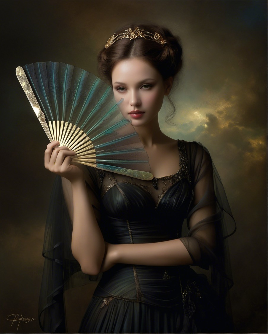 Prompt: beautiful woman holding a fan made from dragonflies. Mysterious woman Surreal dream in the style of pino daeni. Magical nostalgia, glory, Mercury Glass patina, light and gossamer haze, topographic lines, Art Brut, moody, somber, desaturated colors. In the style of John Rogers cox . This artwork amalgamates the artistic styles of Michael Parkes,