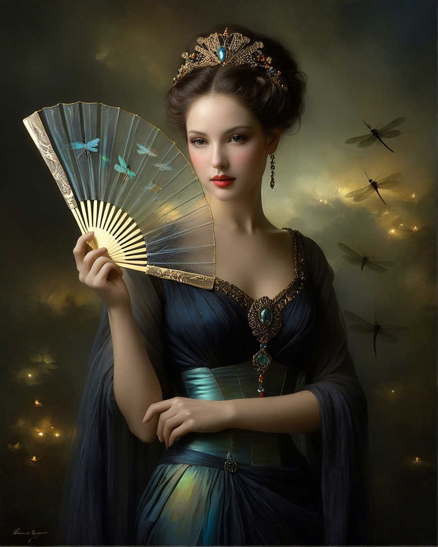 beautiful woman holding a fan made from dragonflies. Mysterious woman Surreal dream in the style of pino daeni. Magical nostalgia, glory, Mercury Glass patina, light and gossamer haze, topographic lines, Art Brut, moody, somber, desaturated colors. In the style of John Rogers cox . This artwork amalgamates the artistic styles of Michael Parkes,