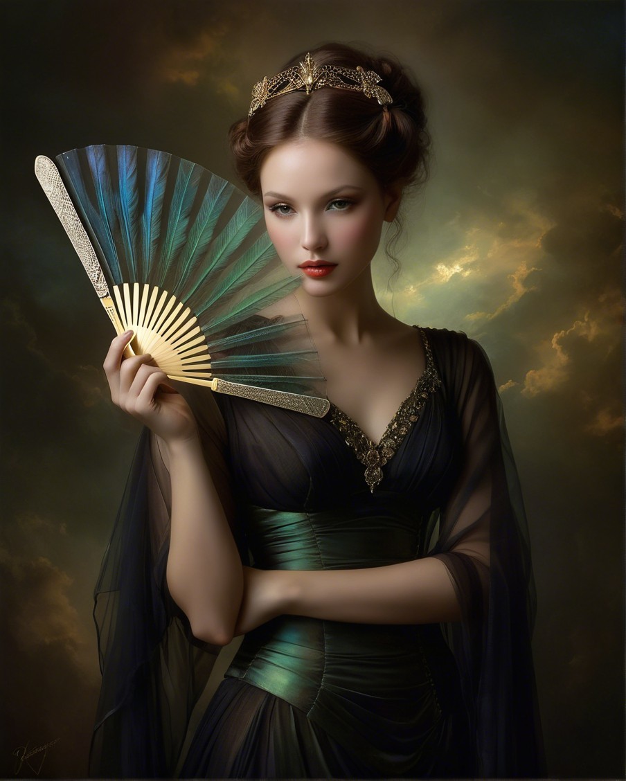 A stunning woman in a flowing teal gown holds a decorative fan, surrounded by a serene landscape at sunset. Her elegant hairstyle is adorned with delicate accessories, enhancing her beauty.