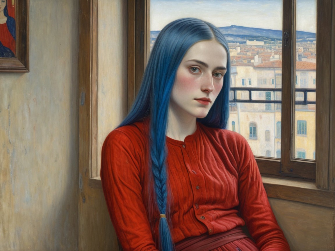 A serious looking young woman with striking blue hair, wearing red clothes, sits by a window overlooking an ordinary looking city, while a religious painting hangs on the wall of the otherwise bare room.