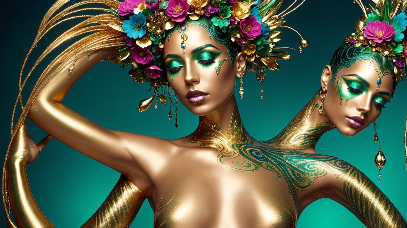 The image features an artistic representation of two golden-skinned figures intertwined, adorned with vibrant floral headdresses and striking makeup, set against a rich green background.