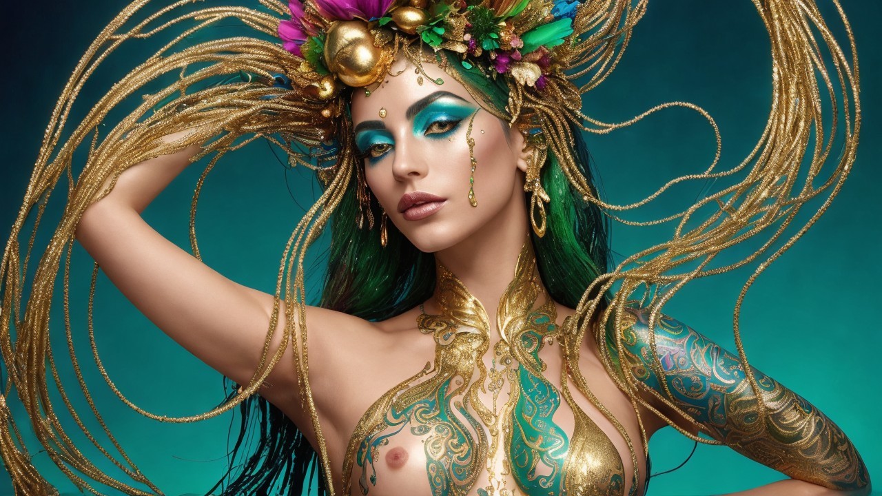 Prompt: "Create an image of a surreal and artistic figure with an elongated neck, adorned in intricate body paint that features vibrant colors of gold, green, and blue. The figure has a metallic sheen and appears to be partially submerged in liquid, with drips of shimmering gold flowing from their skin. Their head is topped with an elaborate arrangement of organic shapes resembling flowers and bubbles, incorporating pink petals and round, textured orbs that blend with golden filaments. The face is delicately painted with exaggerated features, including large, dramatic eyes with deep blue hues and long, dark lashes, and bold red lips that stand out starkly against the painted skin. The background is dark, enhancing the glowing elements of the figure, with ethereal lights and reflections on the water's surface. Add subtle patterns on the water, reminiscent of lily pads, that echo the swirling colors of the figure's paint, creating a harmonious, dreamlike atmosphere.designed by GoBi"