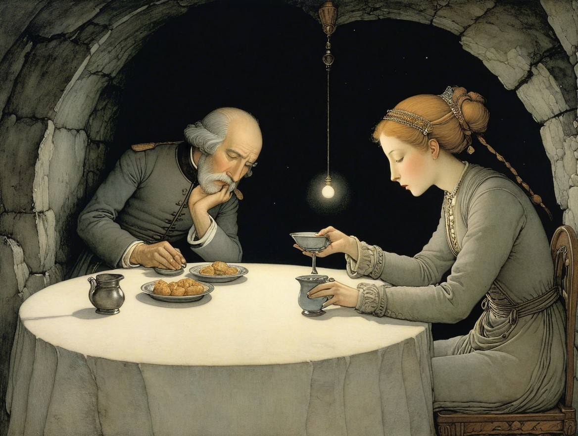 Two elegantly dressed women sit at a table, focused on a white parrot perched on a wooden stand. A sleek black cat lies nearby, all set against a dark, timeless backdrop.