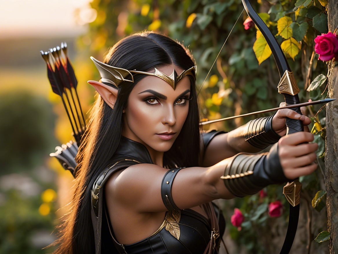 A fierce archer with long black hair and pointed ears draws a bow, adorned in intricate armor. Roses accent her surroundings, creating a striking blend of beauty and strength in a lush setting.