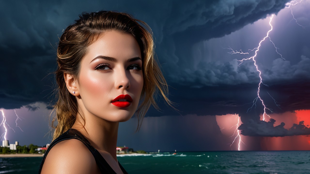 A young woman gazes confidently at the viewer against a dramatic background of dark storm clouds and flashes of lightning over a turbulent ocean. The contrast highlights her striking features.
