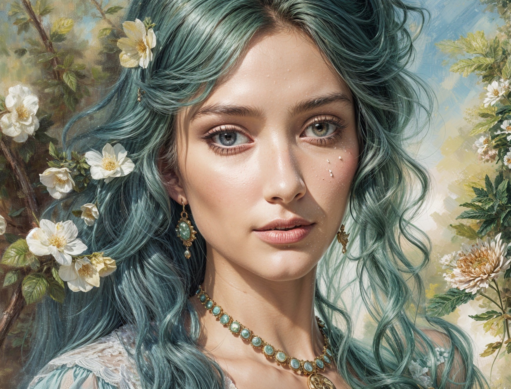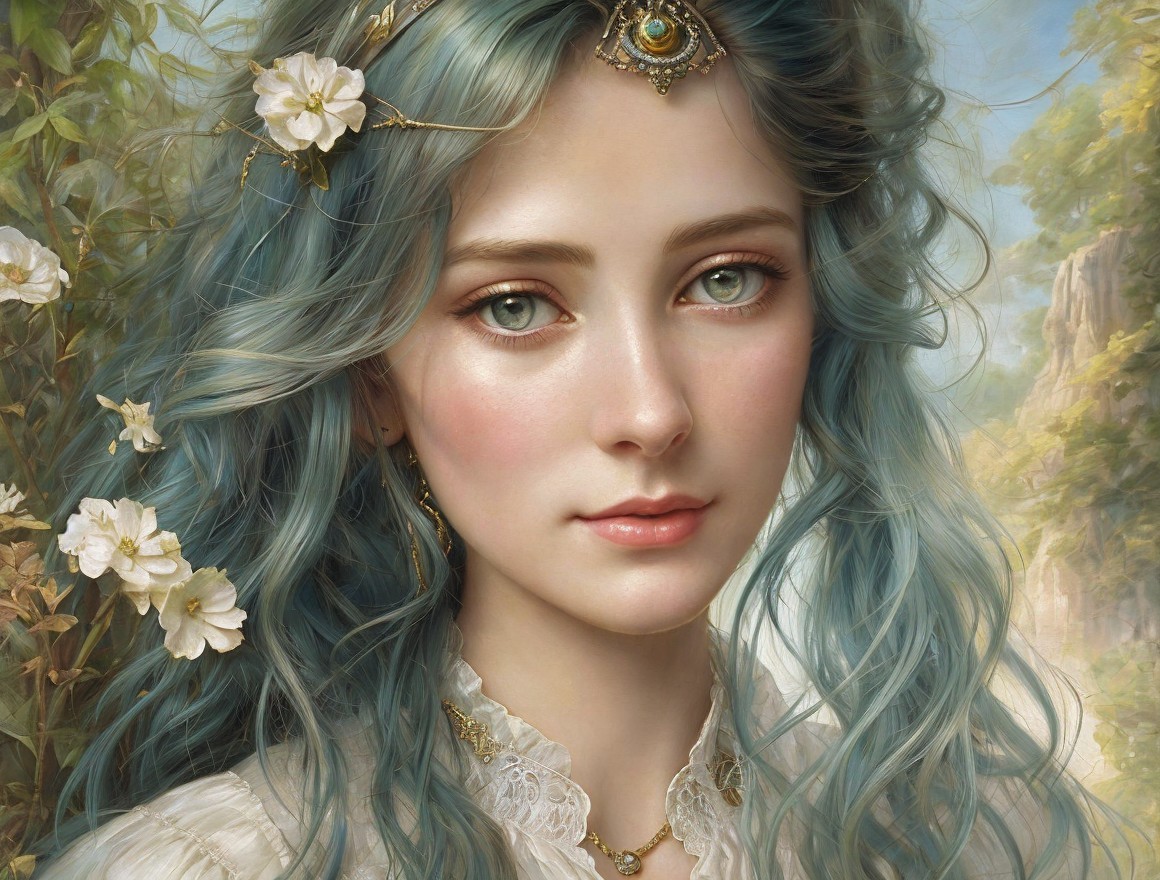 An artwork of a woman with blue wavy hair, green eyes, wearing a gold tiara and earrings, depicted with a serene expression amidst a forest backdrop.