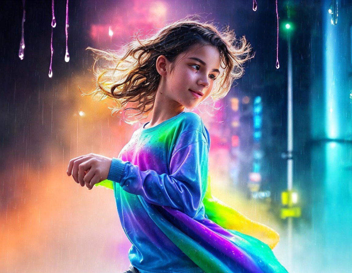 healthy, active teen in a wet t-shirt fluidly dancing moving in the cold wet outside downpour rain
