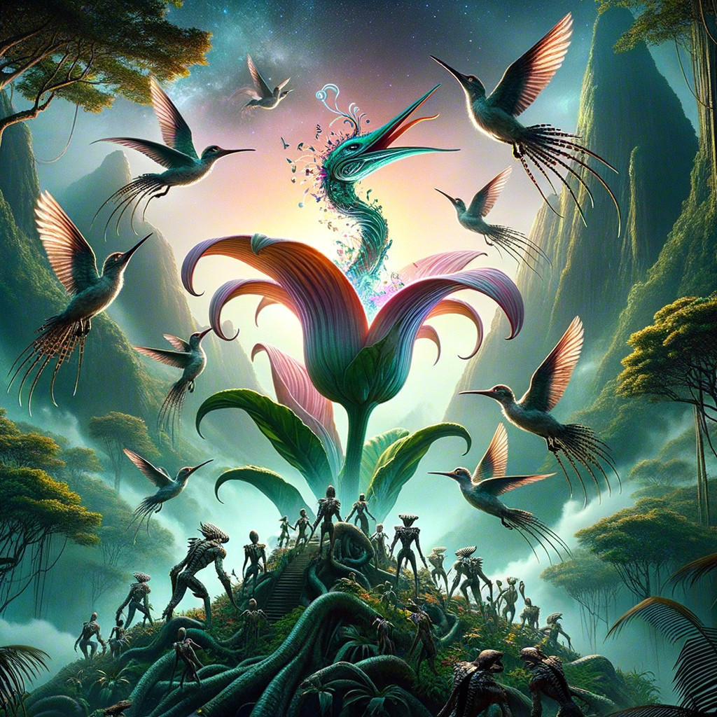 a beautiful sentient alien flower on top of a mountain surrounded by jungle forest; the alien flower has the ability to translate every cultural experience into divine music that brings joy to the universe, reptilian aliens are trying to cut it down using chain saws but are being repelled by giant hummingbirds