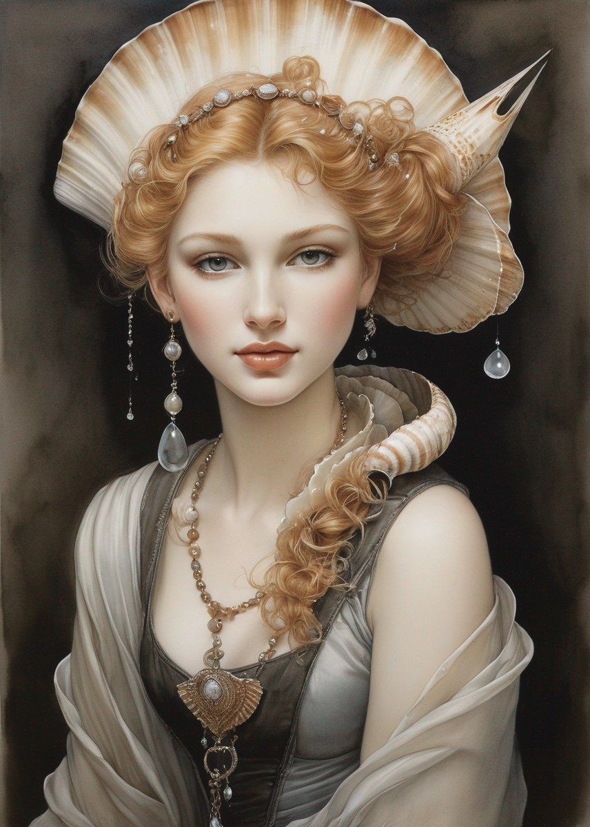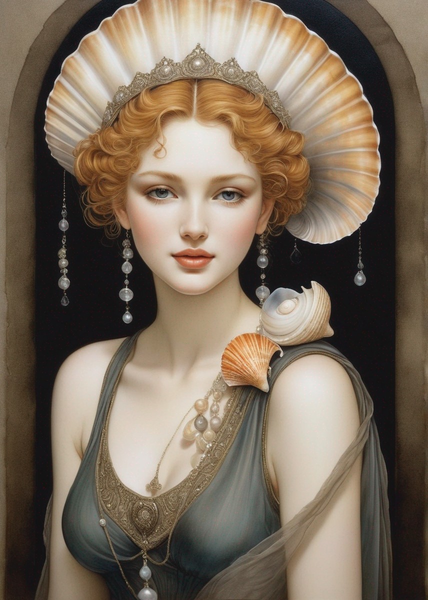 A painting of a woman with an Elizabethan collar, teardrop earrings, and a golden necklace, emanating a serene and regal demeanor.