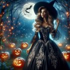 A mystical scene featuring a woman in a stunning black gown and witch hat, surrounded by glowing jack-o'-lanterns and a full moon, with bats flying in a twilight forest.