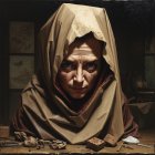 The image features a stylized, angular portrait of a hooded figure, their intense gaze piercing through shadows, surrounded by abstract stone-like forms, conveying a sense of mystery and depth.