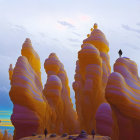 A surreal landscape features towering, orange-hued rock formations, with a soft gradient sky. Two figures stand atop the peaks, while a large sphere hovers in the distance, enhancing the otherworldly feel.