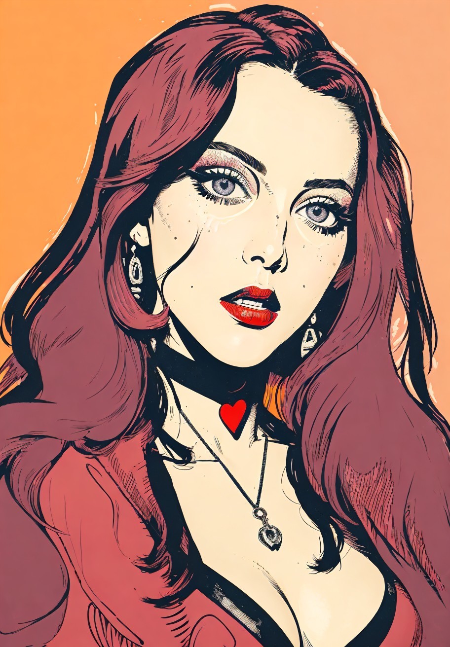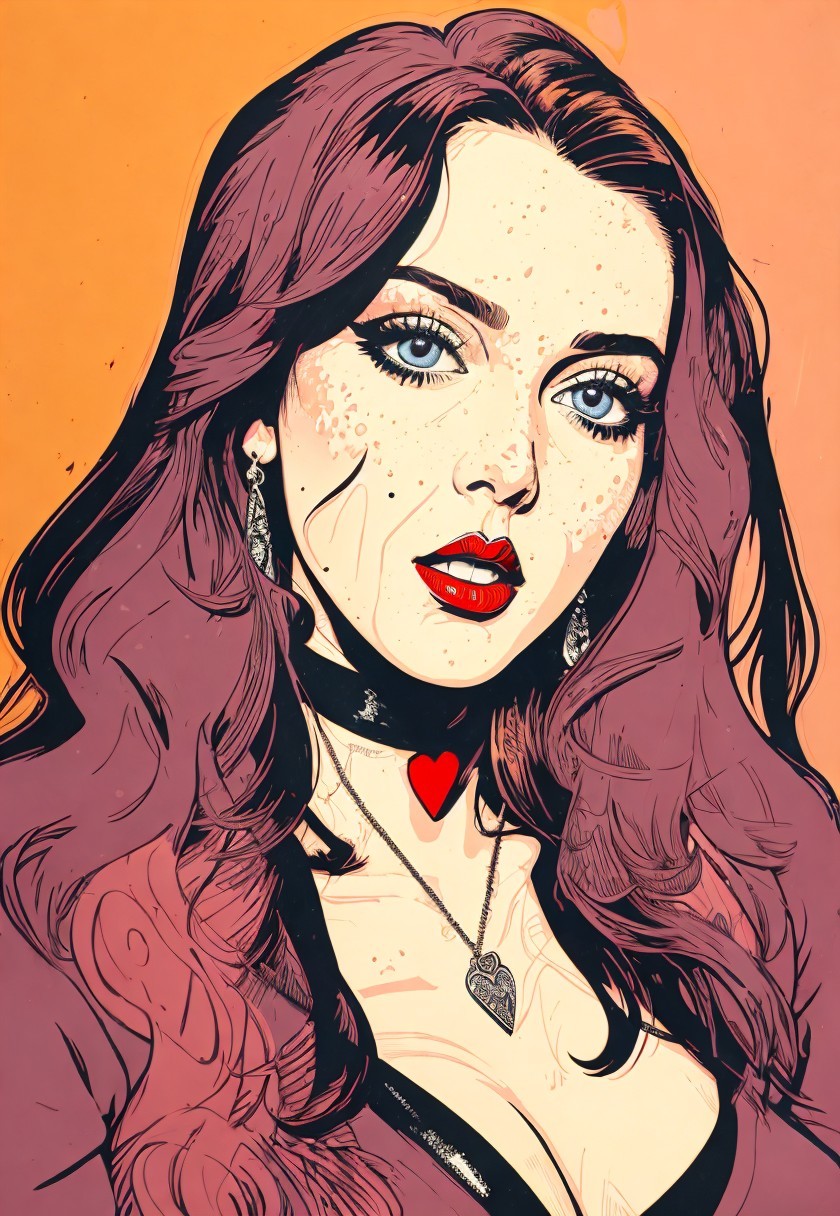 Pop art portrait of teenage temptress, sgraffito style with tints of linocut, tints of mural painting, line-art, individual, stencil, sprayed in the style of Geoff Darrow, stylized illustration in style of Zio Ziegler, Carlo Crivelli, Margaret Keane, Megan Duncanson, 3d effects 1.8, ambient occlusion 1.5, anisotropic filtering 1.3, raytraced shadows 1.8, sublime, triadic color scheme beige red amber, comical, high coloring, eldritch, raytraced shadows 1.8, focused, sublime, cottagegore 1.9, retrofuturistic, atmospheric, coherent, synthetic, stylized illustration 1.8, retrofuturistic, atmospheric, coherent, synthetic, stylized illustration 1.8, soft rounded edges, quilling, quaint, folded paper style 1.9, geometrical illustrative style, illustrative maximalism, radiance, brightness 1.4, intricate hairdo with fine lines, custom_loss: grey,
