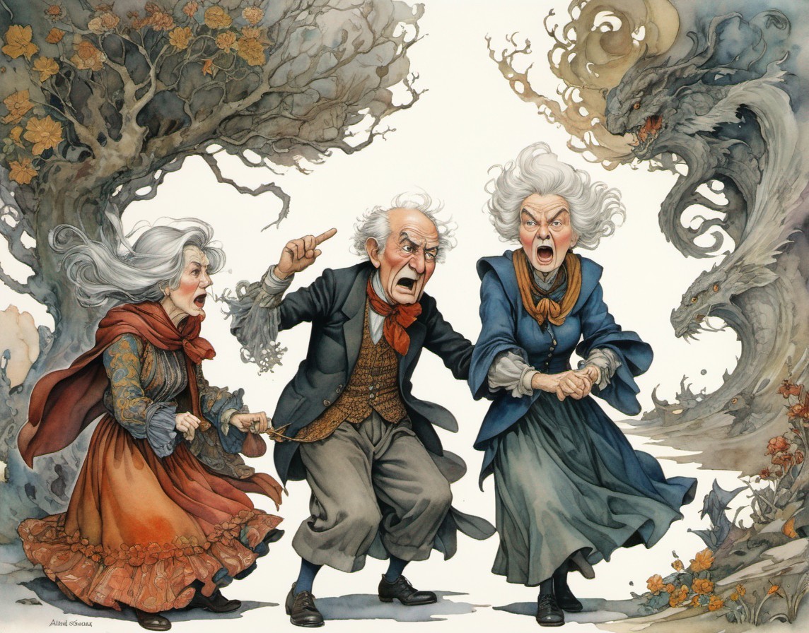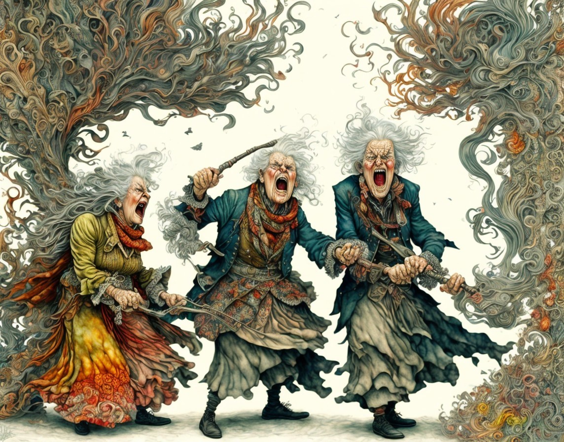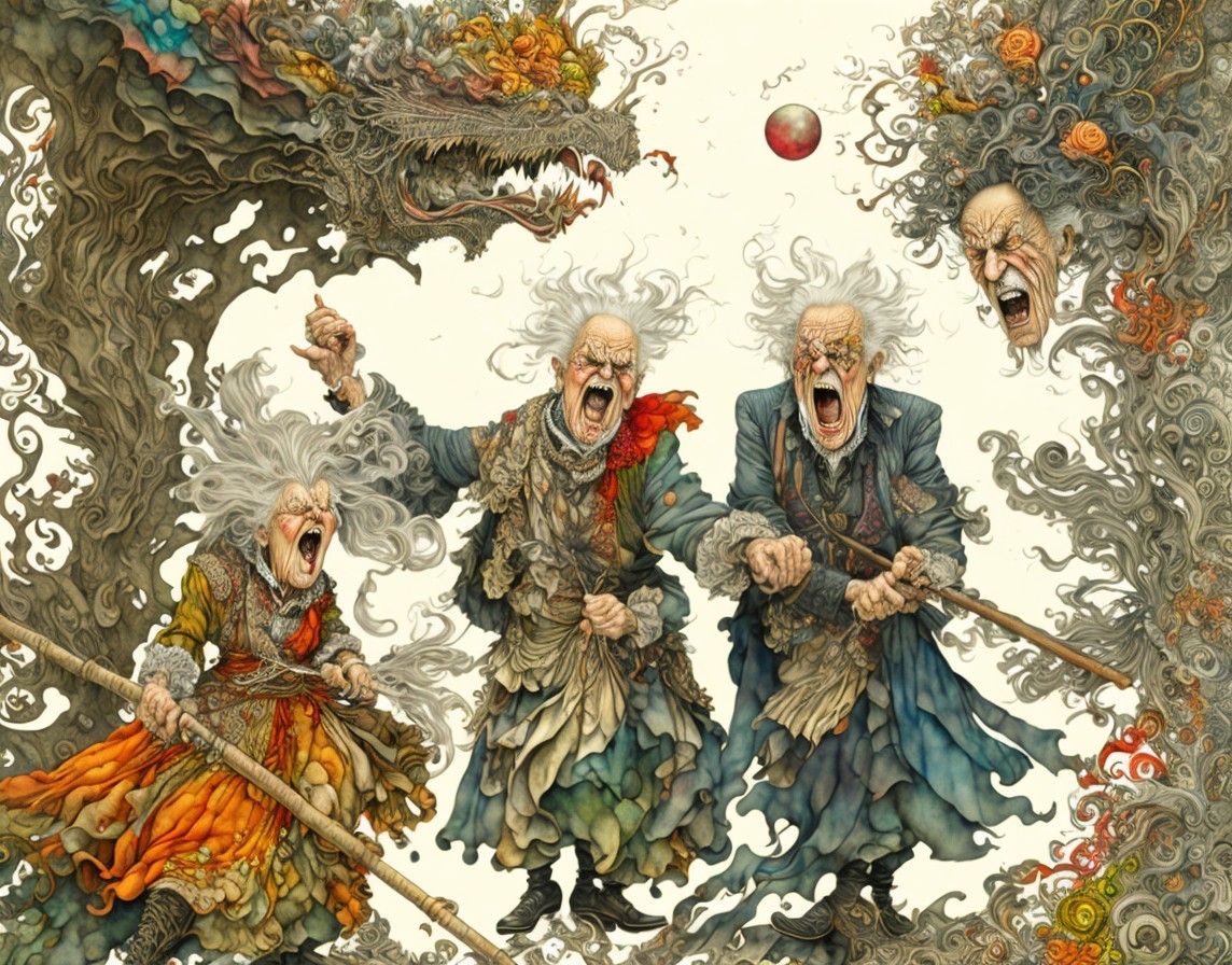 An elderly couple runs from spectral dragons, expressions of terror on their faces, in a fantastical, ominous painting.