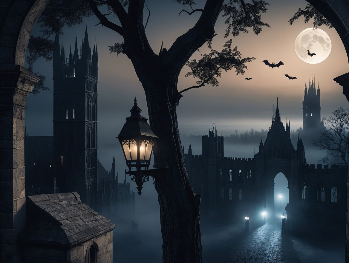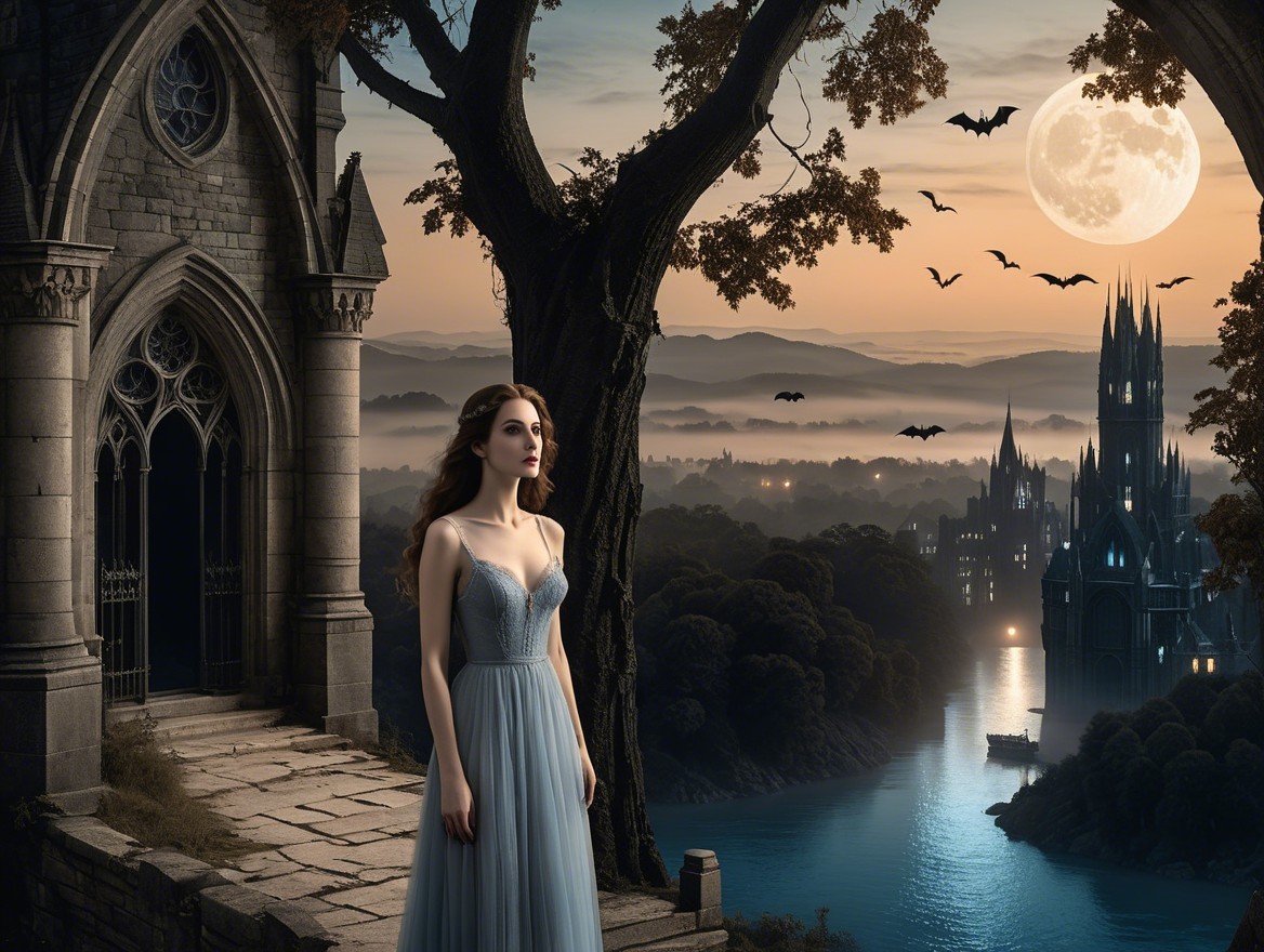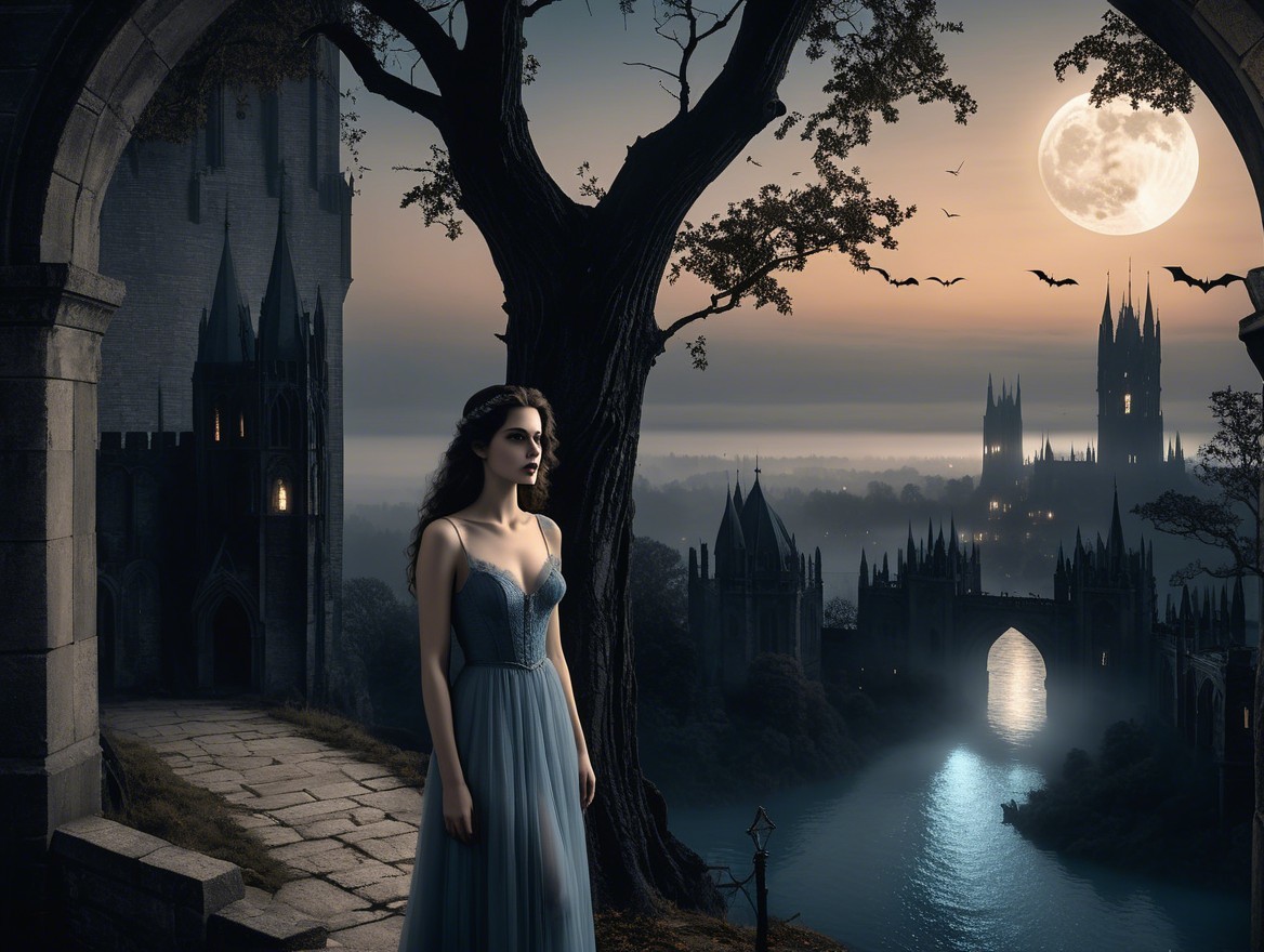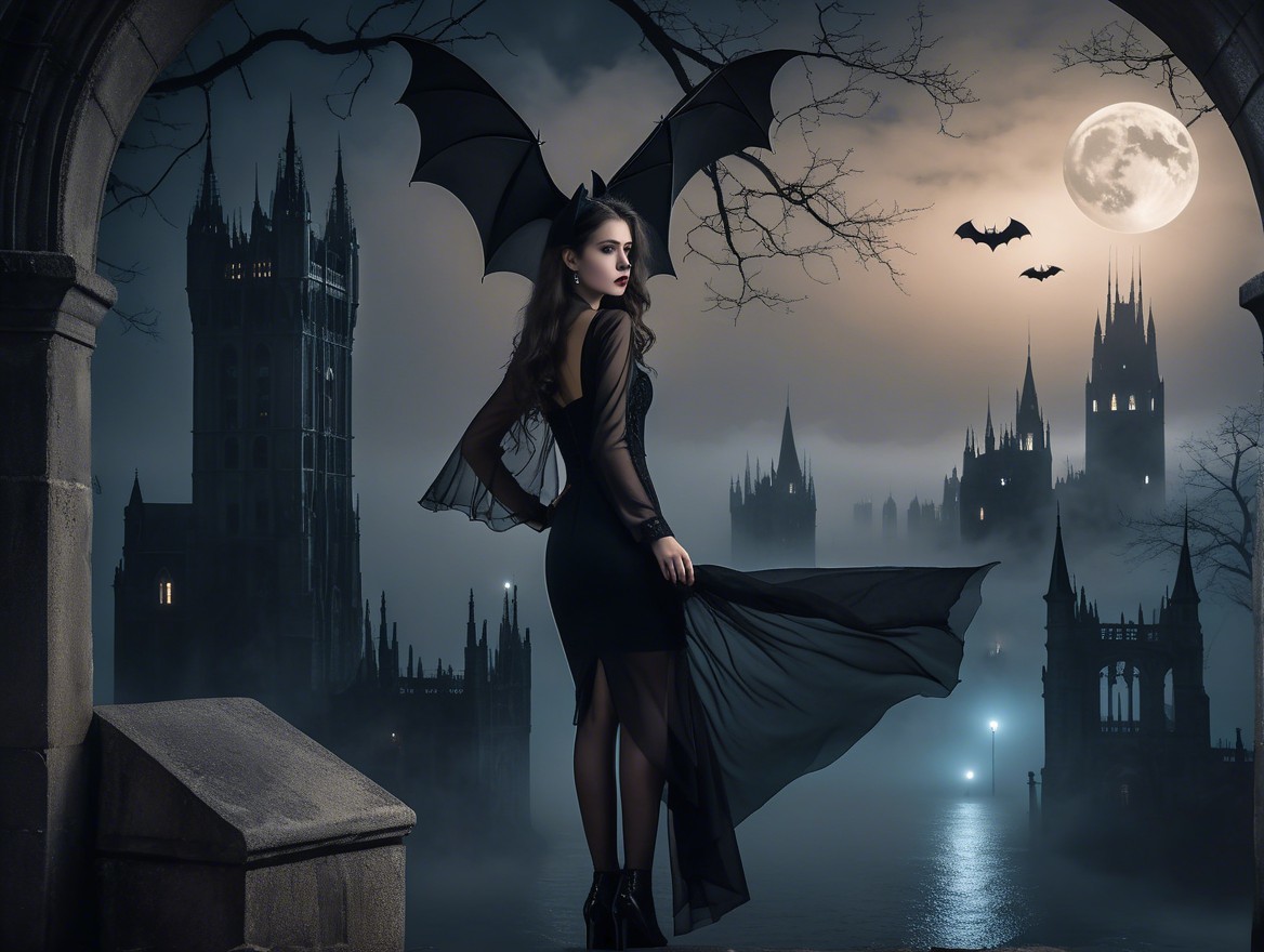 A mysterious figure stands in a dark, gothic setting, adorned in a flowing black dress and bat-winged umbrella. The moon is full, and bats fly through a misty night sky, enhancing the ambiance.