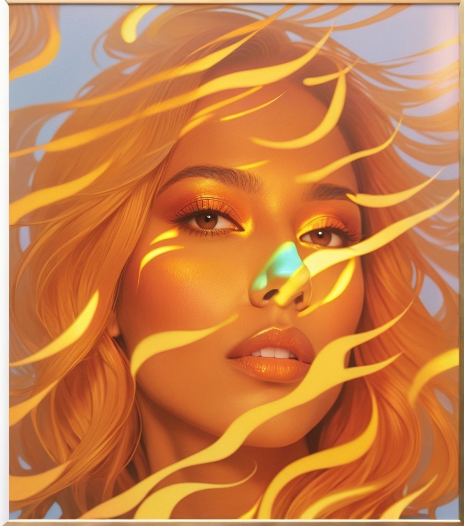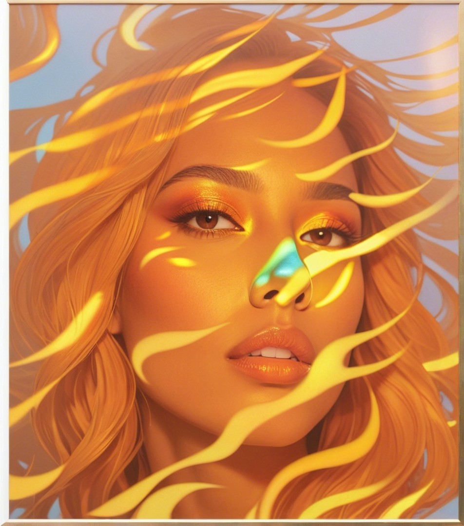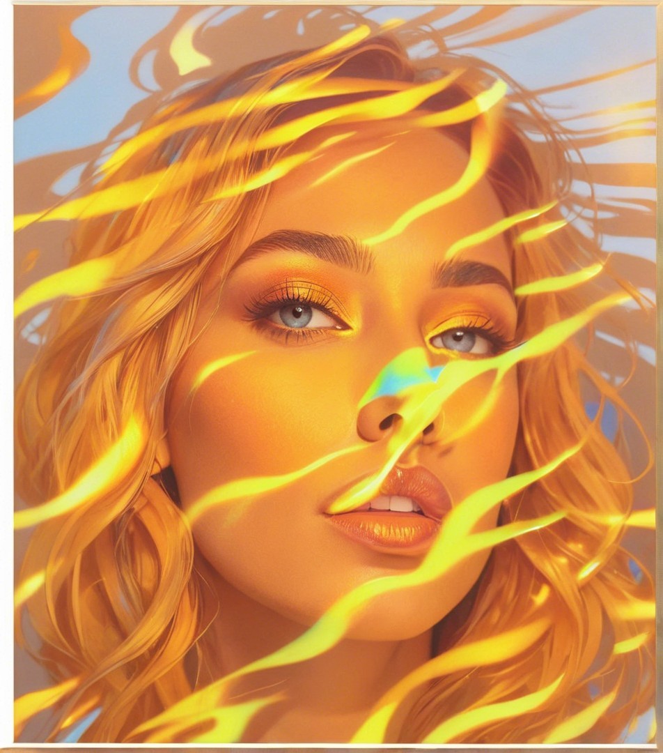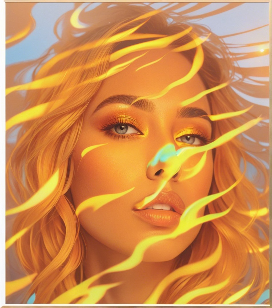 A striking portrait of a woman with golden, flowing hair illuminated by vibrant yellow and orange hues. Her glowing skin and captivating eyes create a warm, ethereal atmosphere.