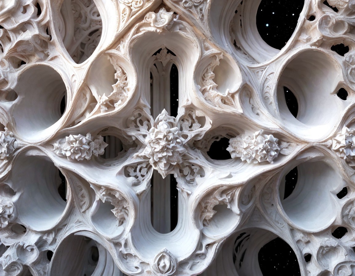 An intricate white fractal with swirling patterns and small details against a dark background, resembling sculpted stone art.