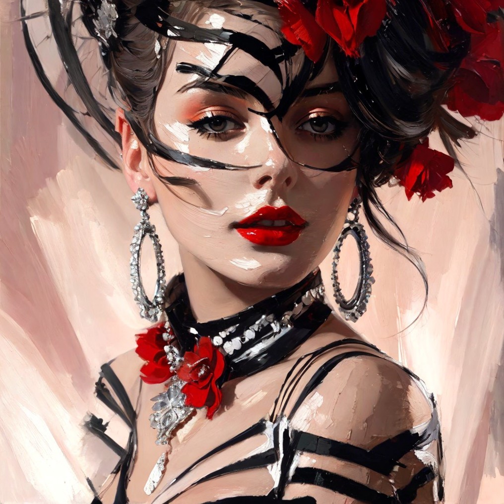A striking woman with dark hair adorned with roses gazes confidently. She wears bold red lipstick and elegant jewelry, set against a soft, colorful background that enhances her allure.