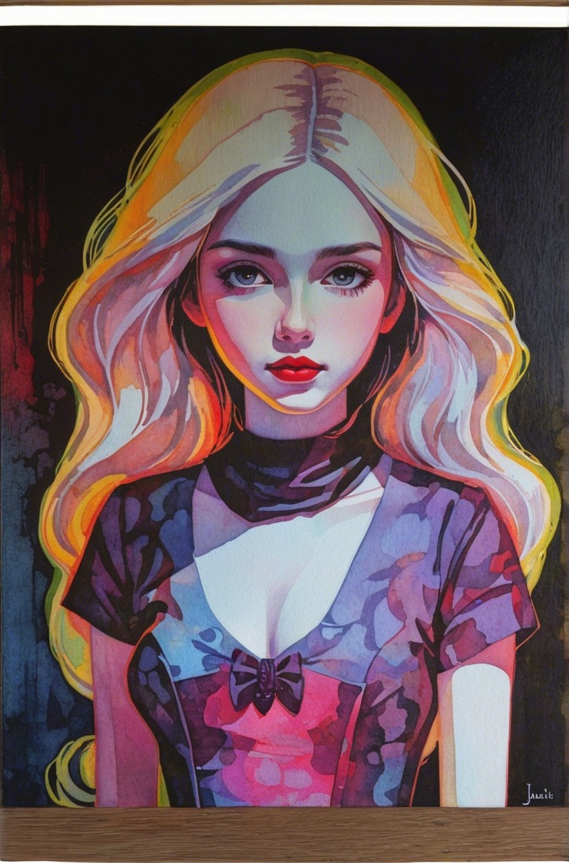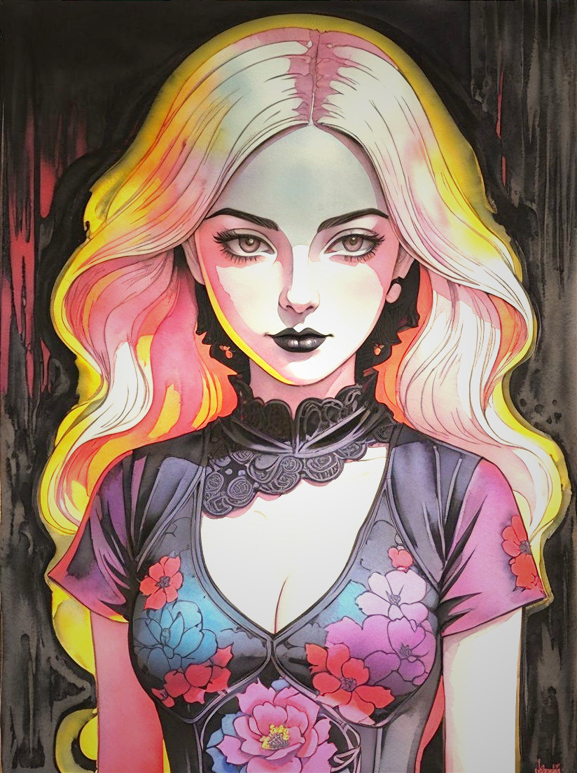 Prompt: Precisionism-inspired woodblock print. stylized portrait with a juvenile essence, whimsical watercolor and ink painting emerges, featuring outlines that intricately define a Gothic maiden with an eerie twist, reminiscent of woodcut-inspired linework, surreal fissured hues in a plique-à-jour technique, stylized, dynamic lighting effects, subsurface scattering 1.9, dyed, parallax occlusion 1.3, brightness 1.8, stippled, bloom-effect, tesselated, angled, upper body portrait, natural, dof, debeh, raytraced shadows 1.3, shadow mapping 1.3, dynamic lighting 1.8, opaque features, flecks, color shapes in magenta and rosewood-pink, hues by Ho Baron, juxtapositions of surrealism.<lora:CorvidiconFlux:1.0> <lora:Dark Art:1.0><lora:Echoform Oxymoron:1.0> <lora:PetalsGrave:1.0> colourful red hair, moonlit, abstract darkwave postpunk. Dark Romanticism. PetalsGrave, patchwork in the style of Man Ray, Laurel Burch, Ho Baron, and Turner. Stippled, blotted, cel-shaded, visible textures. Stylzed Flowing lines hinting at inner motion, serene tranquility, illusion of depth, textured surfaces, contemplative ambiance, minimalistic yet emotionally profound, intricate detailing, precise strokes, dynamic composition, depth perception, monochromatic palette, subtle shading, minimalist approach, evocative simplicity, masterful use of negative space, meditative quality, abstract sepia, gothical elegance, wabi-sabi, ink-dripped glamour and aesthetic. Edwardian Avant Garde fashion, diminishing bokeh effects, minimalistic, abstract asymmentrical line art weaves a whimsical and psychedelic ambiance background with fractal effects, splash ink technique in style of Lawrence Schwinger, colorful yam, warm coloring, gradients of metallic-honey, regionalism merged with classicism, edwardian reminiscence, hyper-maximalism, soft rounded edges, Pencil and Pastels, ink and alcohol, aquatint merged with psychosomatic undertones and a fantastical flair, contoured, line-art, high coloring, lineage details by Ho Baron. 3D textures, parallax occlusion 1.4, reflective mapping 1.3, displacement mapping 1.3, debeh, bokeh, vfx, stacked lines, triadic color scheme of light-ochre, dark-yellow and metallic honey, plasticity 1.3, precise gelsculpt 64k, 3d effects, uhd, hdr, vfx-inspired, hues by Man Ray, micro-pen lineage, small brushstrokes for intricate lineage, zentangle, psychedelic Woodblock Print, precise gelsculpt 64k, textured skin by William Bradley, Novelty architecture, sawtooth wave, overall composition by Katsuhiro Otomo and Stan Lee