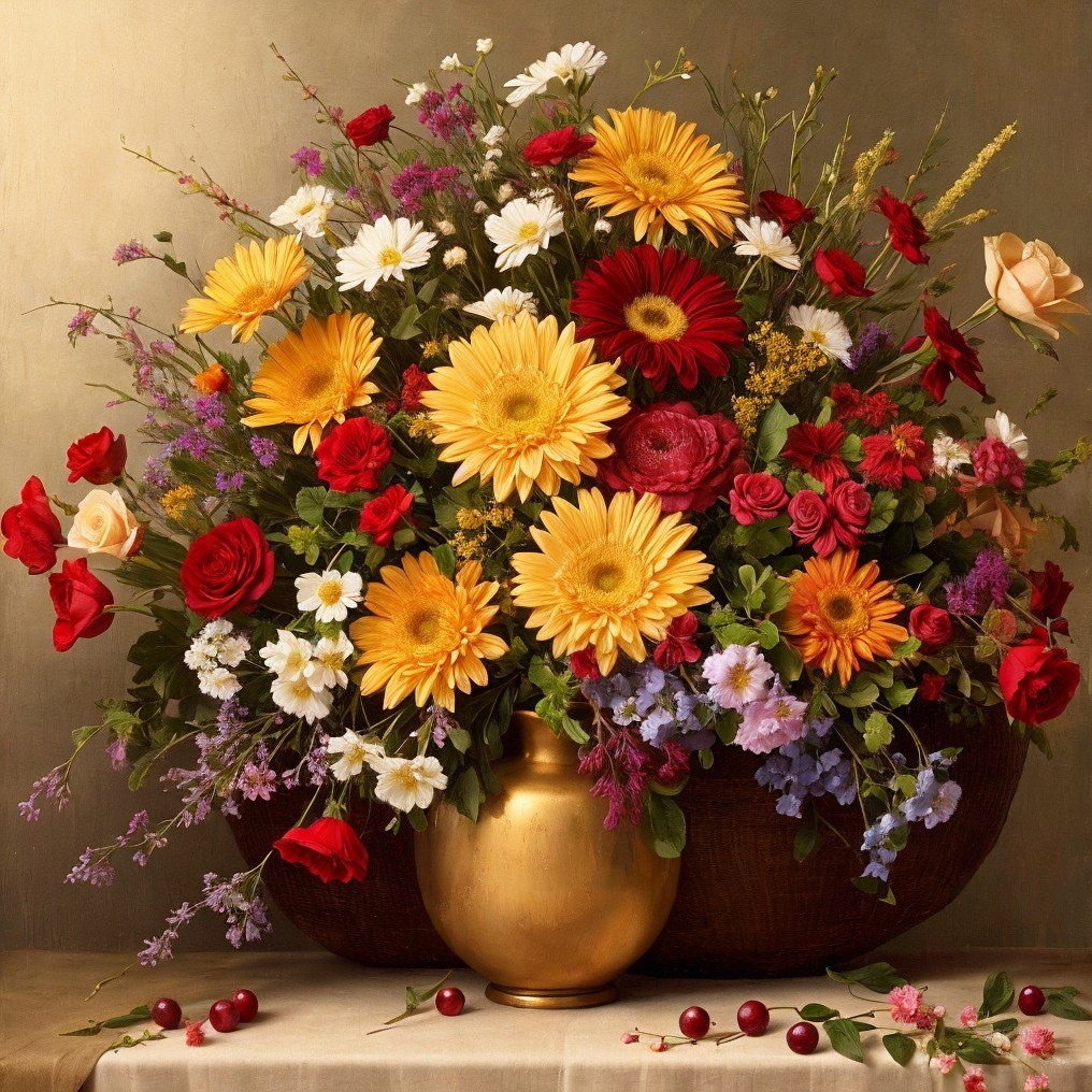 A vibrant painting of a lush bouquet with various flowers in a decorative vase, set against a detailed, ornate background.