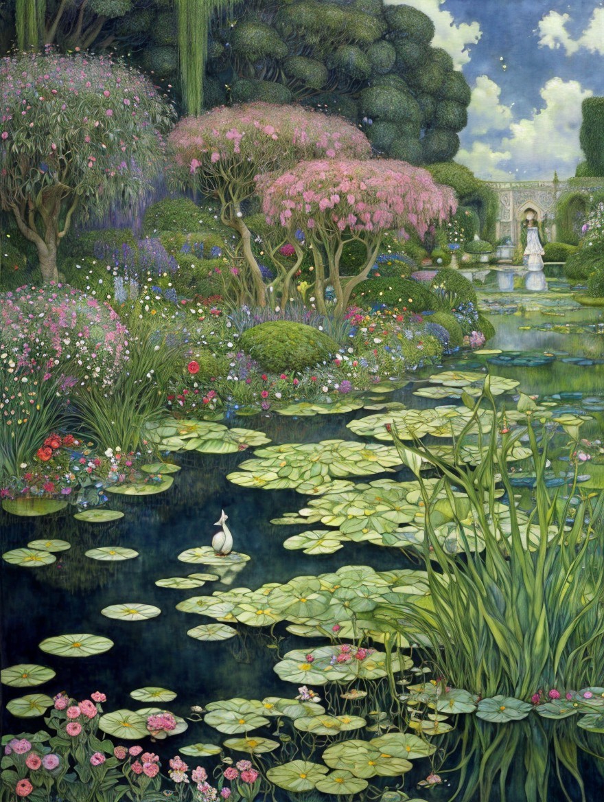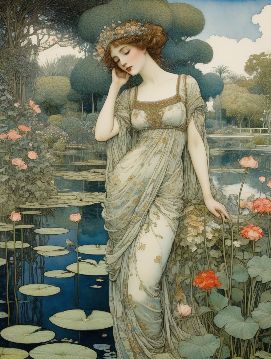 An ethereal woman in flowing attire stands by a pond amidst a blooming garden, exuding a serene, mythical aura.