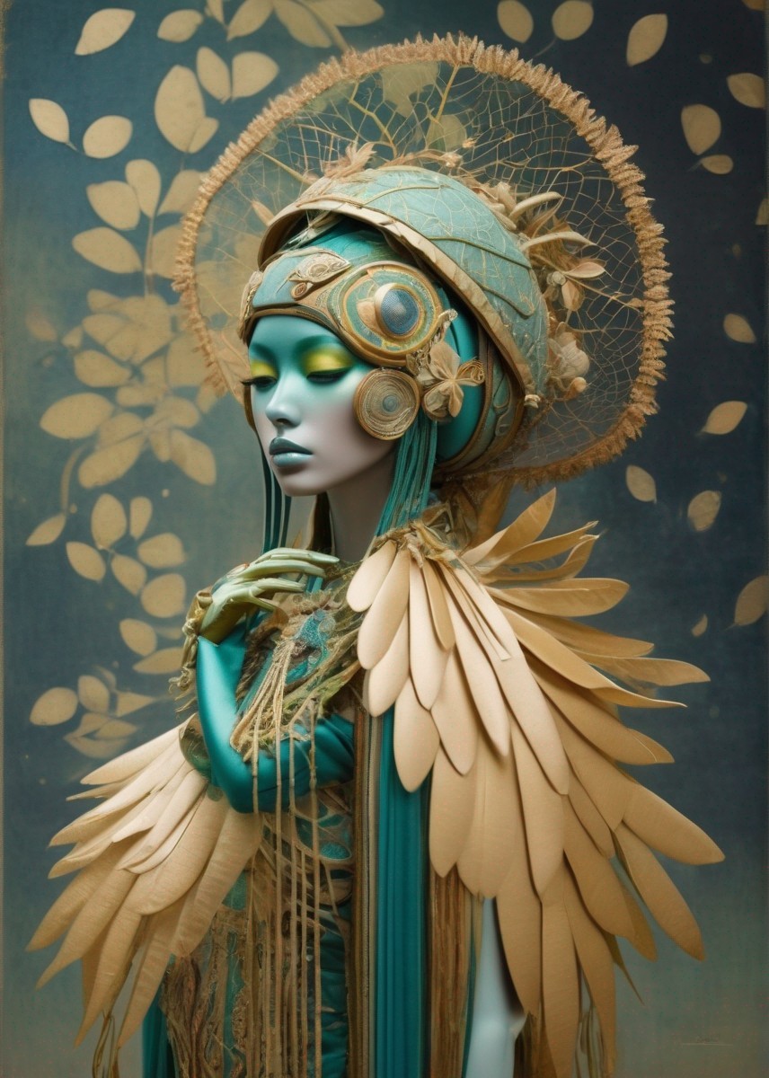Prompt: Masterpiece, tribal, highly stylized costume, praying mantis inspiration, oversized mantis wings headdress, vein-like pattern, faded green color palette, muted green flowers, insect-botanical fusion, oversized spherical green goggles, compound eyes motif, textured teal fabric, embossed vintage upholstery pattern, golden threads, delicate lace patches, leaf-like collar, surreal mantis arm detail, light skin tone, soft matte rose lips, surreal and intricate design, muted green to slate blue gradient background, detailed and textured, bygobi.Ethereal portrait of a mystical being with tribal features, vibrant orange eyes, reptilian pupils, intricate scale-like patterns around the eyes, pale skin adorned with freckles, tribal tattoo on the nose bridge. Adorned in a weathered yellow tribal mask with dark markings, a central rivet, necklaces of gold, black, and red beads, a rustic red and dark green scarf with intricate designs, and small earrings. Serene expression, intense gaze, desaturated background to highlight the subject. Layers of ancient script-covered fabric, hieroglyphs, piercing grey eyes, shadowed hood, aged appearance, cobwebs, armor straps, rich color palette of blues, greens, browns, gold, and silver. Mysterious gaze, detailed illustration by Gobi, Artstation.