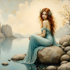 A serene scene featuring a young woman in a flowing aqua gown, sitting on a large rock beside a tranquil water body, surrounded by soft landscapes and gentle mountains in the background.