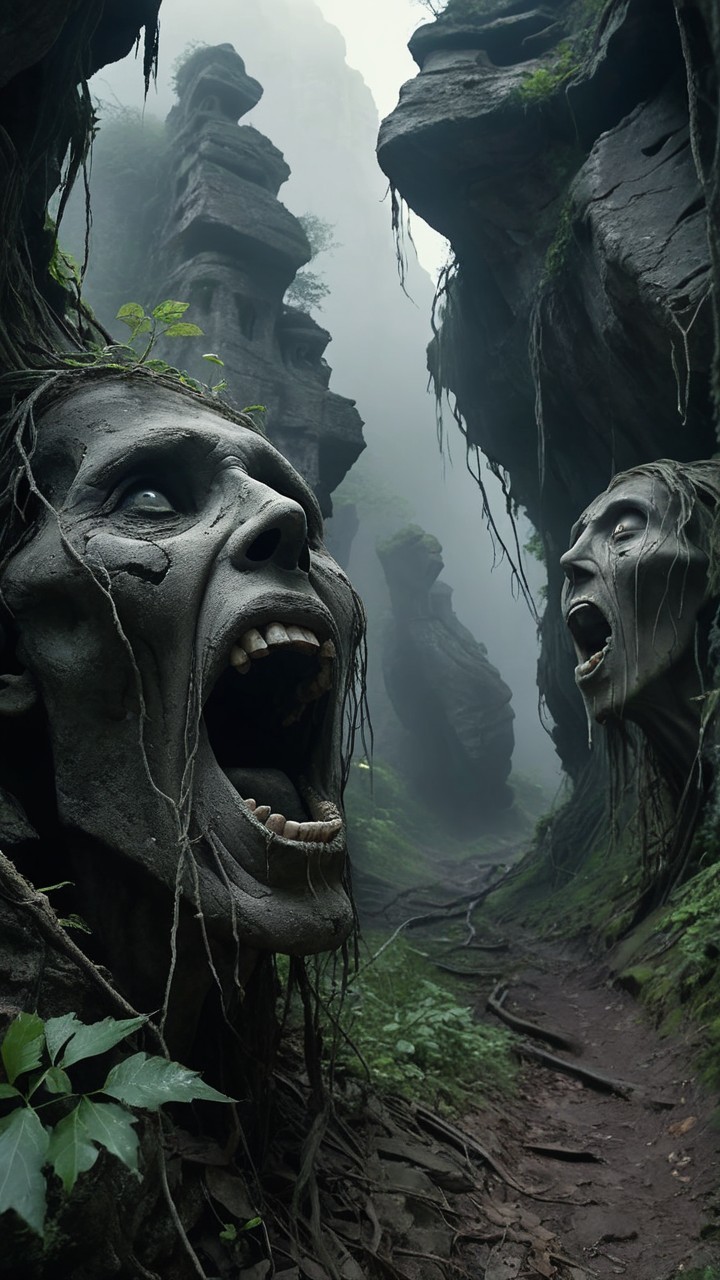 In a misty forest, towering stone faces with expressive, haunting features emerge from the rocky walls. Vines entwine their forms, creating an eerie and mystical atmosphere.