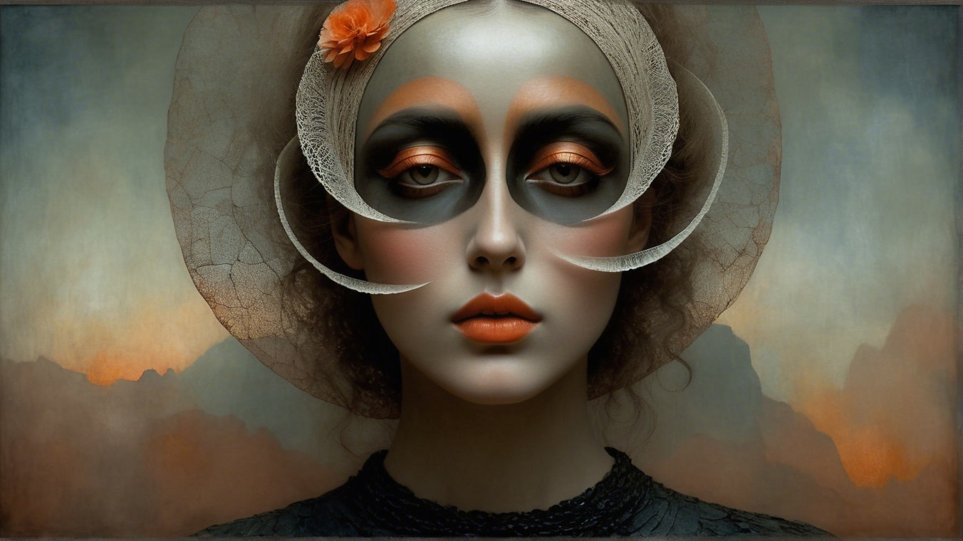 A striking portrait of a woman with bold makeup and a floral accessory, framed by soft feathers. The muted color palette evokes a serene, ethereal atmosphere.