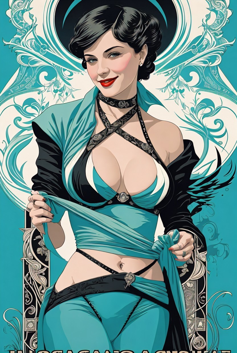 + Prompt:Extremely detailed, badass poster design, Art Noir/Art Nouveau. The artwork features an old, retro traditional patchwork of a 1920's woman in bikini, smiling, elegant and powerful. Minimalist color scheme,