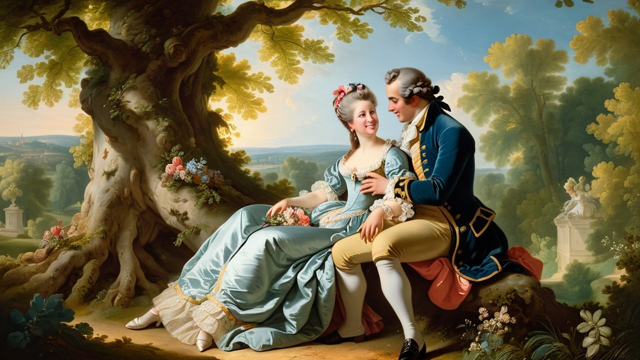 (Try from Sam Rajabi) - A romantic 18th-century scene depicts a couple seated under a lush tree, surrounded by flowers. The woman in a elegant blue gown gazes lovingly at the man beside her, exuding charm and intimacy.