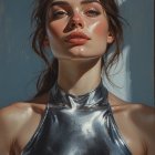 A model stands confidently in a shimmering gold bikini, illuminated by warm, glowing light. The soft focus highlights her features against a dreamy, blurred background.