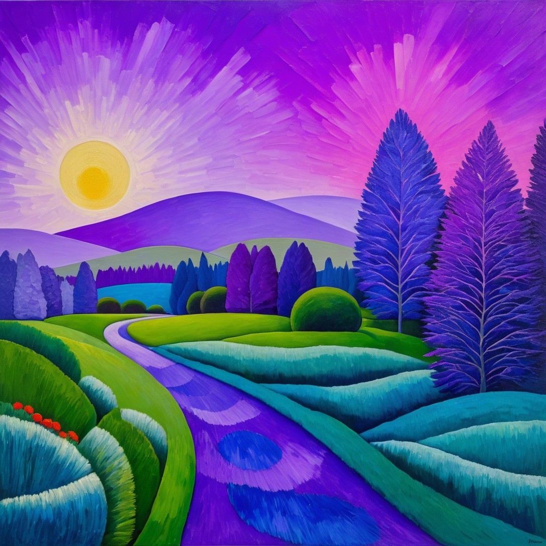 A vibrant landscape featuring rolling hills, a winding river, and tall, colorful trees under a radiant sun and purple sky. The scene embodies a cheerful, surreal atmosphere.